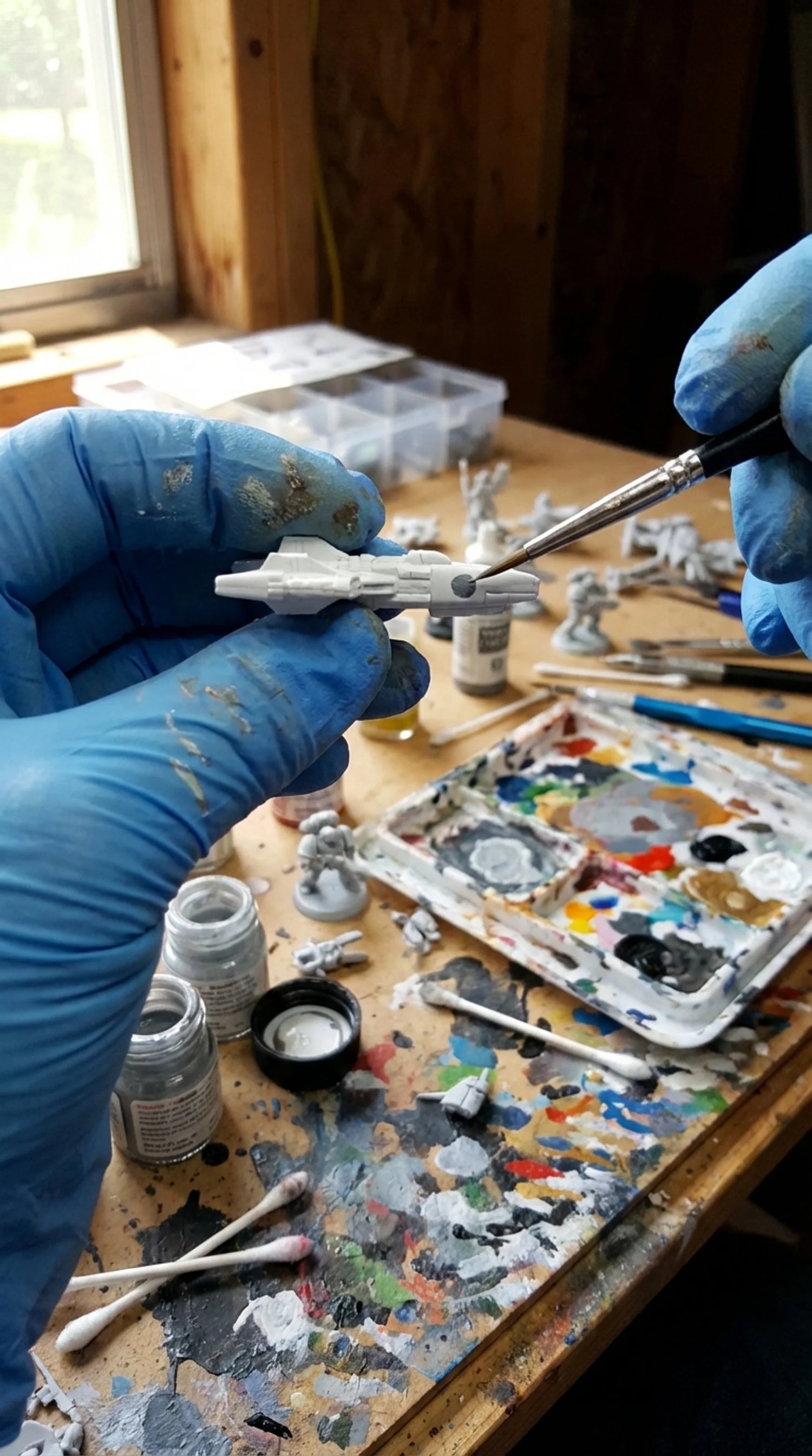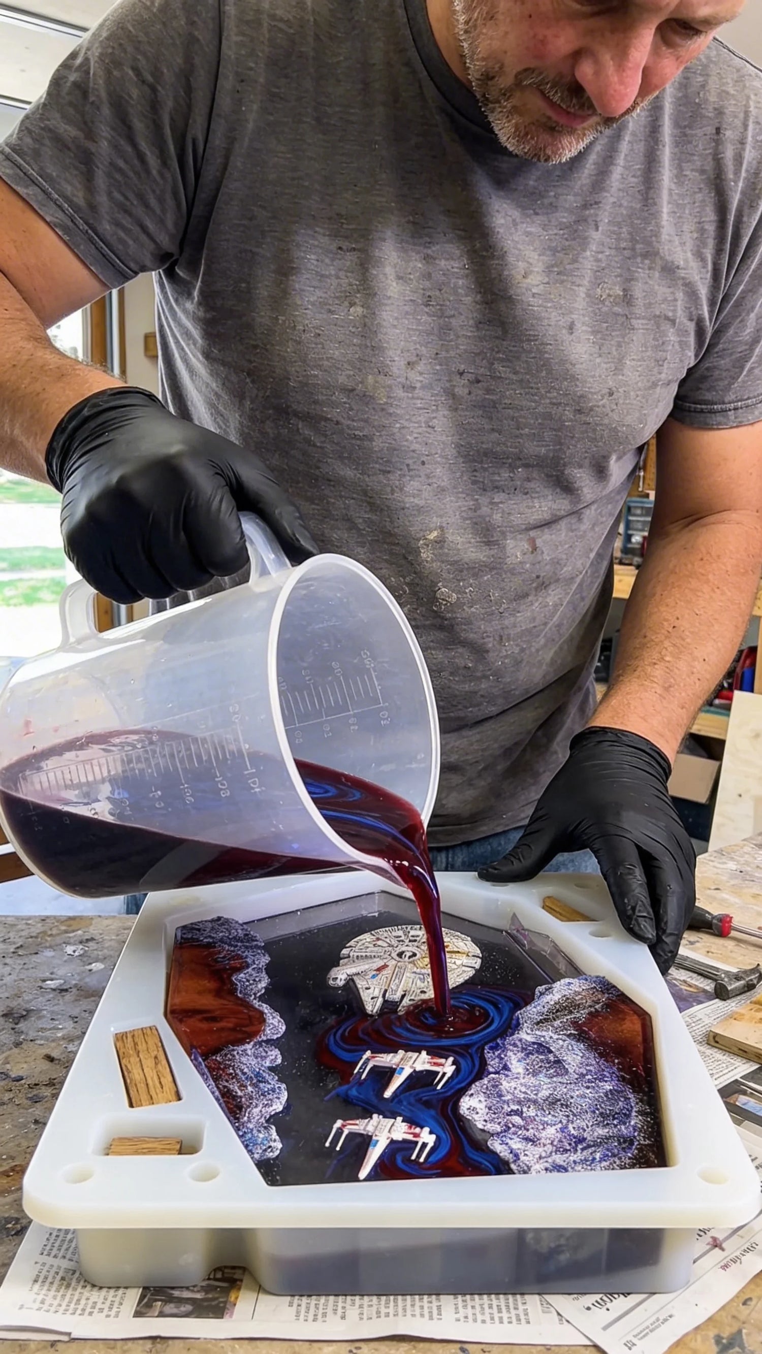 I start with the wood. I pick through burl slabs until I find one with the right grain and the right edges. Then I cut it down and shape it by hand on the lathe. Once the wood is ready I build the mold around it, seal every gap, because if the resin leaks it's over. Then comes the pour. I mix the resin, add the color, and pour it in layers. Each layer has to cure before the next one goes in or you get bubbles and cloudiness. That part alone can take two to three days. Between each layer I place the figures by hand with tweezers, positioning them exactly where I want them suspended in the resin. One wrong move and the whole piece is off. Once the final layer cures I break the mold and start sanding. I go through about eight grits, starting rough and working my way up to a mirror finish. Then I polish it with compound until it's crystal clear. After that I cut the base from walnut, route out the channel for the LED strip, wire it up, and test the light. If everything glows the way it should, it's done. If it doesn't, I start over. Every lamp takes me five to seven days and there's no shortcut for any of it.